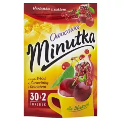 Dane produktowe Minutka Owocowa Herbatka owocowa o smaku wiśni z żurawinką i granatem 64 g (32 torebki) Do produkcji tej herbatki owocowej wykorzystano mieszankę owoców żurawiny, granatu oraz soku z wiśni. Połączenie smaków delikatnej żurawiny, orzeźwiającego, lekko cierpkiego granatu oraz...