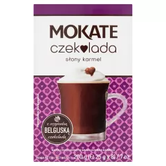 Dane produktowe Mokate Czekolada słony karmel 200 g (8 x 25 g) Składniki: czekolada do picia (61 %) [cukier, kakao w proszku], skrobia modyfikowana, kakao w proszku, aromaty, sól (1,75 %), MLEKO odtłuszczone w proszku, cukier karmelizowany (0,5 %), belgijska czekolada w proszku (0,5 %)...