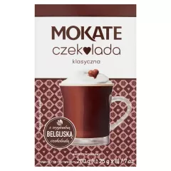 Dane produktowe Mokate Czekolada klasyczna 200 g (8 x 25 g) Składniki: czekolada do picia (69 %) [cukier, kakao w proszku], skrobia modyfikowana, kakao w proszku, MLEKO odtłuszczone w proszku, aromaty, belgijska czekolada w proszku (0,5 %) [cukier, masa kakaowa, kakao w proszku o...