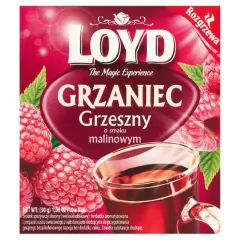 Dane produktowe Loyd Środek spożywczy grzaniec grzeszny o smaku malinowym 30 g (10 x 3 g) Składniki: herbatka aromatyzowana 64,5 % [w tym: kwiat hibiskusa, aromaty, cynamon, liść jeżyny (Rubus suavissimus), korzeń lukrecji, goździki, regulator kwasowości - kwas jabłkowy], preparat...