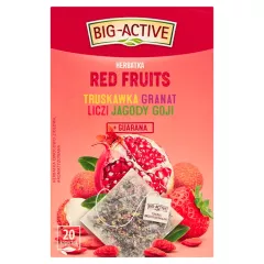 Dane produktowe Big-Active Red Fruits Herbatka 45 g (20 x 2,25 g) Każdą naszą torebkę zapakowaliśmy w kopertkę, która jest gwarancją utrzymania smaku i aromatu. Egzotyczne owoce + zaskakujący składnik - guarana = intrygujący smak Składniki: kwiat hibiskusa, owoc aronii, jabłko, owoc...