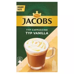 Dane produktowe Jacobs Typ Cappuccino typ Vanilla Rozpuszczalny napój kawowy 96 g (8 x 12 g) Składniki: odtłuszczone MLEKO w proszku, cukier, całkowicie uwodorniony olej kokosowy, maltodekstryna, kawa rozpuszczalna (8 %), syrop glukozowy, aromaty, białka MLEKA, skrobia modyfikowana,...