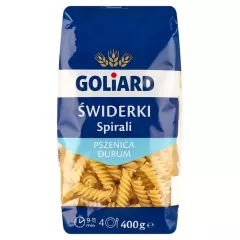 Dane produktowe Goliard Makaron świderki 400 g Pszenica durum to wyselekcjonowany gatunek zboża, z którego powstaje semolina - mąka do wyrobu wysokiej jakości makaronów. Makarony otrzymane z semoliny dłużej pozostają jędrne, sprężyste i lekko twarde. Najlepiej podawać al dente....