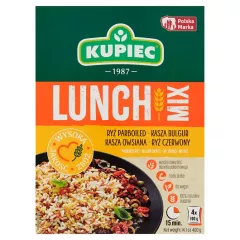 Dane produktowe Kupiec Lunch Mix Ryż parboiled kasza bulgur kasza owsiana ryż czerwony 400 g (4 x 100 g) Posiadamy certyfikowane systemy Zarządzania Bezpieczeństwem Żywności. Szczegółowe informacje i certyfikaty dostępne na naszej stronie www.kupiec.pl Składniki: ryż parboiled 35 %,...