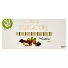 Baron Delicadore Intense Dark Czekolada gorzka 126 g (6 x 21 g) Czekolada. Składniki miazga kakaowa, cukier, tłuszcz kakaowy, tłuszcz mleczny , emulgator: lecytyny (z soi ), ekstrakt z wanilii, pasta z orzeszków arachidowych , Masa kakaowa minimum 70 % Wartość odżywcza w 100 g Wartość...