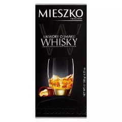 Dane produktowe Mieszko Likwory o smaku whisky 180 g Składniki: czekolada (61%) [miazga kakaowa, cukier, tłuszcz roślinny (palmowy, shea, sal, z ziarna mango) w zmiennych proporcjach, emulgator: lecytyny (z SOI), aromat, tłuszcz MLECZNY], cukier, syrop glukozowy, substancja...