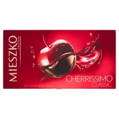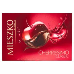 Dane produktowe Mieszko Cherrissimo Classic Praliny z wiśnią w alkoholu 142 g Składniki: czekolada (50%) [cukier, miazga kakaowa, tłuszcze roślinne (palmowy, shea, sal, ziarno owocu mango) w zmiennych proporcjach, tłuszcz kakaowy, tłuszcz MLECZNY, emulgatory: lecytyny (z SOI) i E...