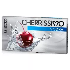 Dane produktowe Mieszko Cherrissimo Vodka Praliny z wiśnią w alkoholu 142 g Składniki: czekolada (50 %) [cukier, miazga kakaowa, tłuszcze roślinne (palmowy, shea), tłuszcz kakaowy, emulgatory: lecytyny (z SOI) i E 476, aromat], cukier, wiśnia w alkoholu (13 %) (wiśnia, alkohol...