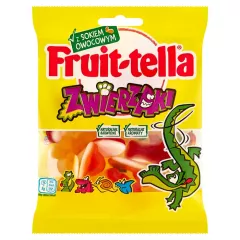 Dane produktowe Fruittella Zwierzaki Żelki o smaku owocowym 90 g Miłośnicy owoców zainspirowali Fruittella do stworzenia tych pysznych, naturalnie barwionych żelków z sokiem owocowym i naturalnymi aromatami. Ciesz się i dziel z innymi fantastycznie owocowym smakiem! Składniki: syrop...
