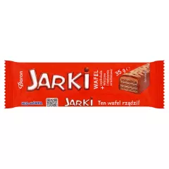 Dane produktowe Baron Jarki Wafel + czekolada mleczna i nadzienie arachidowe 35 g Składniki: wafel z kremem kakaowym [mąka PSZENNA, tłuszcz palmowy, cukier, serwatka w proszku (z MLEKA), kakao w proszku o obniżonej zawartości tłuszczu 4,3 % w waflu z kremem kakaowym, MLEKO w proszku...