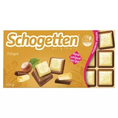 Dane produktowe Schogetten Czekolada biała z krokantem z orzechów laskowych z czekoladą mleczną 100 g Składniki: cukier, tłuszcz kakaowy, MLEKO pełne w proszku, ORZECHY LASKOWE (8,7 %), miazga kakaowa, laktoza (z MLEKA), serwatka słodka w proszku (z MLEKA), tłuszcz MLECZNY, emulgator...