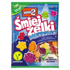 Dane produktowe nimm2 Śmiejżelki Mlekosmici Żelki owocowe wzbogacone witaminami 90 g Kosmiczne żelki z mlekiem w 6 smakach: Malina Cytryna Jagoda Jabłko Brzoskwinia-marakuja Wiśnia Składniki: syrop glukozowy, cukier, skrobia modyfikowana, sok owocowy (5 %) z zagęszczonego soku...