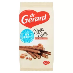 Dane produktowe dr Gerard Rolls Rolls Rurka waflowa z kremem o smaku słonego karmelu 144 g Składniki: cukier, mąka PSZENNA, tłuszcz roślinny (shea), serwatka w proszku (z MLEKA), olej rzepakowy, MLEKO pełne w proszku, glukoza, skrobia ziemniaczana, karmel naturalny (0,8%), barwnik:...