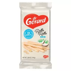 Dane produktowe dr Gerard Rolls Rolls Rurki waflowe z kremem kokosowym 144 g Składniki: cukier, mąka PSZENNA, tłuszcz roślinny palmowy, LAKTOZA, wiórki kokosowe 10 %, serwatka w proszku (z MLEKA), glukoza, MLEKO odtłuszczone w proszku, aromaty, olej rzepakowy, emulgator: E322 (z...