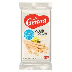 Dane produktowe dr Gerard Rolls Rolls Rurki waflowe z kremem o smaku waniliowym 144 g Składniki: cukier, tłuszcz roślinny palmowy, mąka PSZENNA, serwatka (z MLEKA) w proszku, LAKTOZA, glukoza, MLEKO odtłuszczone w proszku, aromaty, emulgator: E322 (z rzepaku), sól, sproszkowana laska...