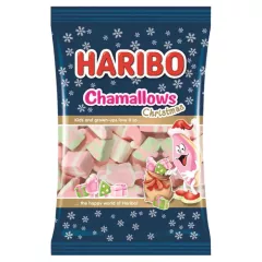 Dane produktowe Haribo Chamallows Christmas Pianki 160 g Składniki: syrop glukozowy, cukier, dekstroza, woda, substancja utrzymująca wilgoć: syrop sorbitolowy, żelatyna, aromat, barwniki: karmina, kurkumina, kompleksy miedziowe chlorofilin Dodatki Marka Haribo Dodatkowe...