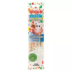 Dane produktowe Quick Milk Magic Sipper Słomki smakowe do mleka o smaku owoców i płatków zbożowych 30 g (5 x 6 g) Składniki: cukier, syrop glukozowy, dekstroza, aromaty naturalne: limonka, cytryna, pomarańcza, wiśnia, jagoda, jeżyna, płatki zbożowe, barwniki: kurkuma, koszenila, błękit...