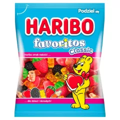 Dane produktowe Haribo Favoritos Classic Żelki o samu owocowym część o smaku coli 150 g Skład mieszanki losowy. Składniki: syrop glukozowy, cukier, woda, żelatyna, dekstroza, substancja utrzymująca wilgoć: syrop sorbitolowy, skrobia, kwas: kwas cytrynowy, soki owocowe z zagęszczonych...