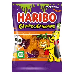 Dane produktowe Haribo Ghostly Gummies Żelki o smaku owocowym 90 g Składniki: syrop glukozowy, cukier, żelatyna, kwas: kwas cytrynowy, olej słonecznikowy, aromaty, koncentraty owocowe i roślinne: batat, rzodkiew, spirulina, krokosz barwierski, pomarańcza, cytryna, mango, marakuja,...