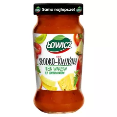 Dane produktowe Łowicz Sos słodko-kwaśny 500 g Składniki: woda, cukier, marchew, cebula (8,8 %), pomidory (8 %), koncentrat pomidorowy (5 %), papryka czerwona (4,4 %), papryka zielona (4,4 %), ananas (3,4 %), przecier jabłkowy, ocet spirytusowy, skrobia modyfikowana kukurydziana, pędy...