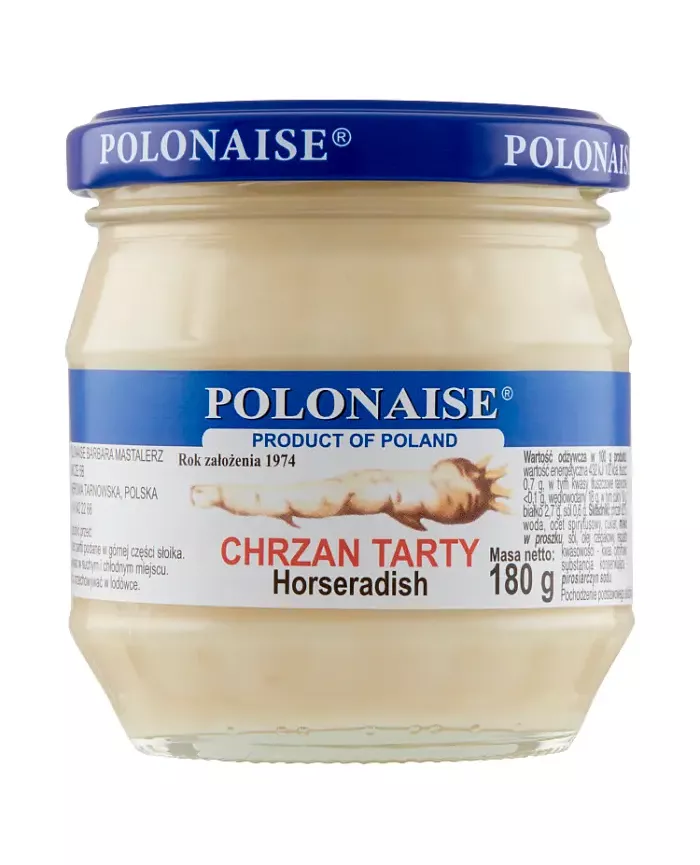 chrzan 62%, woda, ocet spirytusowy, cukier, MLEKO W PROSZKU, sól, olej rzepakowy, regulator kwasowości - kwas cytrynowy, substancja konserwująca - PIROSIARCZYN SODU