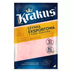 Dane produktowe Krakus Szynka z piersi kurczaka 100 g Składniki: mięso z piersi kurczaka (90%), woda, skrobia modyfikowana, sól, regulatory kwasowości (octany potasu, mleczan potasu), stabilizatory (trifosforany, difosforany, polifosforany, fosforany sodu, chlorek potasu), przyprawy i...