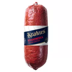 Dane produktowe Krakus Kiełbasa krakowska sucha ekstra Produkt w osłonce niejadalnej. Przed spożyciem zdjąć osłonkę. Składniki: mięso wieprzowe, sól, przyprawy, stabilizator - E331, przeciwutleniacz - E136, substancja konserwująca - E250, Na 100 g wyrobu gotowego zużyto 143 g mięsa...