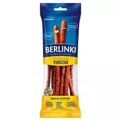 Dane produktowe Berlinki Classic Kiełbasa 85 g Składniki: mięso drobiowe z kurczaka, mięso wieprzowe (100 g gotowego wyrobu otrzymano ze 116 g mięsa, w tym 64 g mięsa drobiowego z kurczaka i 52 g mięsa wieprzowego), tłuszcz wieprzowy, skrobia ziemniaczana, błonniki (w tym PSZENNY...
