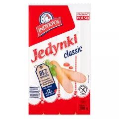 Dane produktowe Indykpol Parówki Jedynki classic 200 g Składniki: mięso z indyka 81%, woda, tłuszcz indyczy, sól, skrobia ziemniaczana, przyprawy, ekstrakty przypraw (w tym: SELER), aromaty, przeciwutleniacz: izoaskorbinian sodu, substancja konserwująca: azotyn sodu Dodatki: Nie...