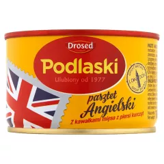 Dane produktowe Drosed Podlaski Pasztet Angielski z kawałkami mięsa z piersi kurcząt 160 g Śniadanie w Anglii jest zazwyczaj solidne, i taka też może być kanapka z angielską pastą sandwich. Pasztet z kurcząt zawiera w sobie dodatkowo kawałki delikatnej piersi drobiowej. Jest to treściwa...