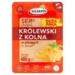 Dane produktowe Mlekpol Ser królewski z Kolna w plastrach 400 g Składniki: MLEKO, sól, kultury bakterii mlekowych, stabilizator: chlorek wapnia Dodatki Marka Mlekpol Dodatkowe informacje Przechowywanie Przechowywać w temperaturze od 0 °C do +10 °C. Po otwarciu...