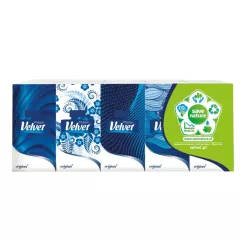 Dane produktowe Velvet Original Chusteczki higieniczne 10 x 10 sztuk Delikatne chusteczki higieniczne Velvet Original to składające się z czterech warstw mięciutkiej bibułki chusteczki, które zostały zapakowane w pojedyncze paczuszki z wygodnym do otwierania klipsem. Każdą z 5 paczuszek...