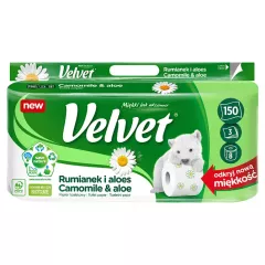 Dane produktowe Velvet ecoRoll Camomile & Aloe Papier toaletowy 4 rolki Papier toaletowy zapachowy, 4 rolki, 3 warstwy. Długość 4 rolek Velvet EcoROLL odpowiada 8 standardowym rolkom papieru Velvet Delikatnie Biały. Wszystkie dane odnoszą się do porównania papieru Velvet EcoROLL do...