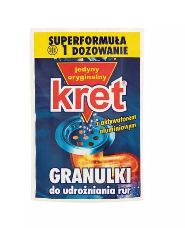 Produkt do chemicznego udrożniania rur i syfonów w instalacjach kanalizacyjnych, który samoczynnie usuwa wszelkie zanieczyszczenia stałe i organiczne. Likwiduje nieprzyjemne zapachy. Są takie miejsca w domu, do których nie jesteśmy w stanie dotrzeć. Właśnie tam, w kanalizacji, zbierają się zanieczyszczenia powodujące zatory w rurach. Zastosuj kreta i zapomnij o problemie. Regularne stosowanie granulek Kret skutecznie zapobiega zapychaniu się rur i syfonów.
