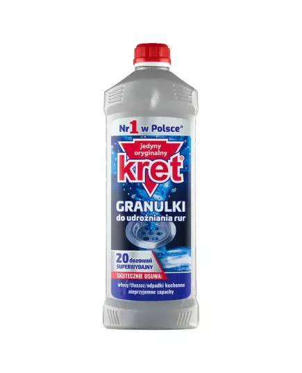 Produkt do chemicznego udrożniania rur i syfonów w instalacjach kanalizacyjnych, który samoczynnie usuwa wszelkie zanieczyszczenia stałe i organiczne. Likwiduje nieprzyjemne zapachy. Są takie miejsca w domu, do których nie jesteśmy w stanie dotrzeć. Właśnie tam, w kanalizacji, zbierają się zanieczyszczenia powodujące zatory w rurach. Zastosuj kreta i zapomnij o problemie. Regularne stosowanie granulek Kret skutecznie zapobiega zapychaniu się rur i syfonów. Stosuj profilaktycznie raz w tygodniu.