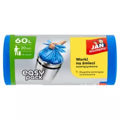 Dane produktowe Jan Niezbędny Easy-Pack Worki na śmieci 60 l 20 sztuk Worki posiadają specjalne "uszy", które można zawiązywać, co ułatwia przenoszenie worka i zapobiega wypadaniu śmieci, - są mocne i estetyczne, - wykonane z materiału HDPE w kolorze niebiesko-metalicznym, - posiadają biały...