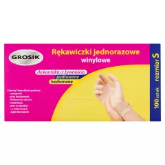 Dane produktowe Grosik Rękawiczki jednorazowe winylowe rozmiar S 100 sztuk Rękawiczki niesterylne winylowe, lekko pudrowane do krótkotrwałego kontaktu z żywnością niezawierającą tłuszczu. Mogą ich używać osoby uczulone na lateks. Transport w opakowaniu typu karton. Składniki: Dodatki...