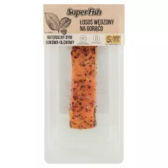 Dane produktowe SuperFish Łosoś wędzony na gorąco z pieprzem 100 g Łosoś wędzony na gorąco w dymie bukowo-olchowym Składniki: ŁOSOŚ atlantycki (Salmo salar - wyhodowane w Norwegii), sól, pieprz 1 % Dodatki: Marka: SuperFish Dodatkowe informacje: Facebook:...