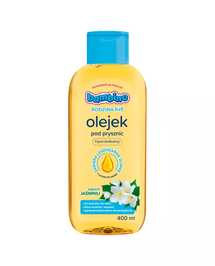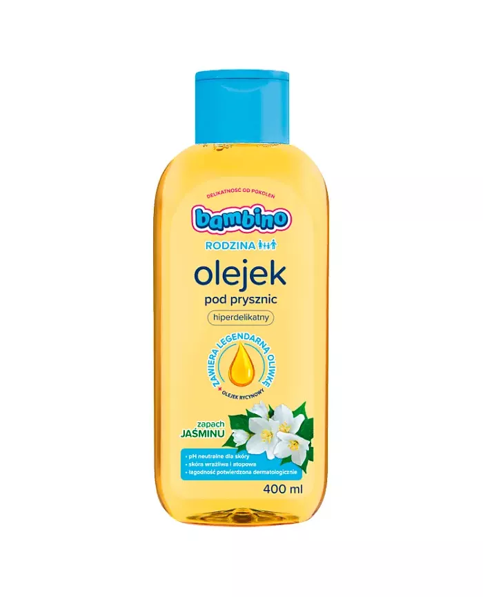 Łagodny olejek pod prysznic i do kąpieli w wannie do codziennego stosowania. Zawiera 57% natualnych olejków roślinnych, legendarną oliwkę Bambino i olejek rycynowy. Utrzymuje prawidłowe nawilżenie skóry i zapobiega podrażnieniom. Delikatna, bogata formuła, opracowana dla całej rodziny, elikatnie oczyszcza i łagodzi skórę, zapewniając jej ukojenie i subtelny zapach jaśminu. Sprawia, że skóra jest gładka i miękka w dotyku.