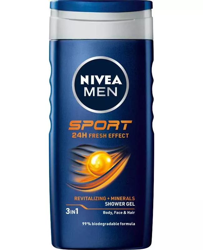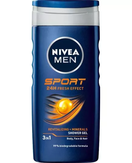 Odkryj regenerujący żel pod prysznic dla mężczyzn NIVEA MEN Sport 24h Fresh Effect! Ten wyjątkowy kosmetyk do mycia o zapachu limonki tworzy pobudzającą pianę i odpręża zmęczone ciało, zwłaszcza po sportowej aktywności. Dzięki zawartości minerałów, męski żel pod prysznic zapewnia długotrwałą pielęgnację i skutecznie oczyszcza ciało, twarz i włosy. Jego świeży, męski zapach daje przyjemne uczucie czystości i świeżości, które pozostaną z Tobą na dłużej. To prawdziwy zastrzyk energii pod prysznicem, a dodatkowo jego formuła jest przyjazna planecie: nie zawiera mikroplastików* i jest w 99% biodegradowalna**! *Zgodnie z definicją UNEP **Zgodnie z OECD lub zbliżonymi metodami