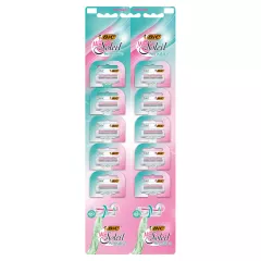 Dane produktowe BiC Miss Soleil Sensitive 3-ostrzowa maszynka do golenia 10 sztuk Trzyostrzowa maszynka do golenia. Mniej podrażnienia niż w przypadku BIC Miss Soleil. - 3 niezależnie ruchome ostrza maszynki indywidualnie dopasowują się do konturów ciała - Pasek nawilżający z aloesem i...