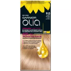 Dane produktowe Garnier Olia Farba do włosów jasny blond 9.0 Moc olejków dla maksymalnego efektu koloryzacji i poprawy widocznej jakości włosów Maksymalny efekt koloryzacji - Intensywny i równomierny kolor - Do 100% pokrycia siwych włosów - Świetliste refleksy - Długotrwały i lśniący kolor...