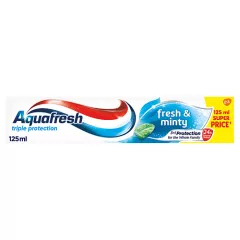 Dane produktowe Aquafresh Triple Protection Fresh & Minty Pasta do zębów 125 ml Pasta Aquafresh Fresh & Minty to rodzinna pasta 3 w 1o świeżym smaku. Zapewnia 24-godzinną ochronę szkliwa dzięki fluorkowi, który chroni zęby przed działaniem kwasów cukrowych przez całą dobę*. *przy...