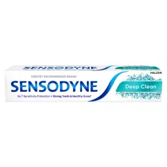 Dane produktowe Sensodyne Deep Clean Pasta do zębów z fluorkiem 75 ml Jeśli podczas spożywania gorących, zimnych, słodkich i kwaśnych pokarmów, a nawet szczotkowania zębów odczuwasz krótki, przenikliwy ból, może to oznaczać, że Twoje zęby są nadwrażliwe. Pasta do zębów z fluorkiem Sensodyne...