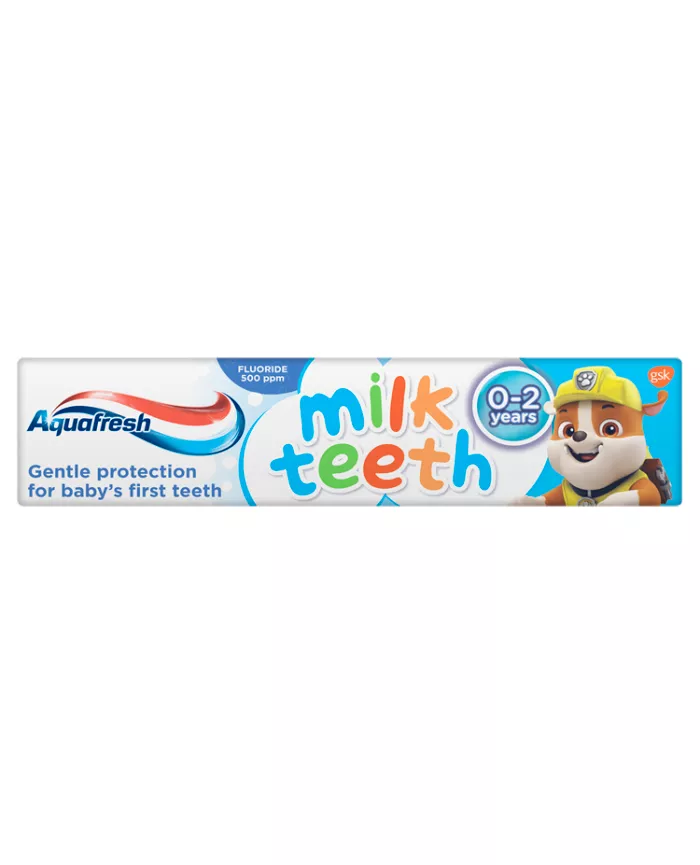 Małe ząbki wymagają jak najlepszej pielęgnacji, aby były zdrowe i silne. Zadbaj o mleczne zęby swojej pociechy wraz z pastą Aquafresh Milk Teeth, która została opracowana specjalnie dla dzieci w wieku 0-2 lata. Jej starannie skomponowana formuła jest odpowiednia w codziennej higienie mlecznych zębów, a zawarte w niej składniki sprawiają, że łagodnie oczyszcza mleczne zęby z bakterii, resztek jedzenia i osadu gromadzącego się na ich powierzchni. Aquafresh Milk Teeth została dodatkowo wzbogacona odpowiednią dla najmłodszych ilością fluorku. Dzięki niemu tworzy na ząbkach dziecka osłonę, która zapobiega szkodliwemu działaniu kwasów cukrowych oraz zapewnia delikatną ochroną przed próchnicą. Wszystko po to, aby pierwsze ząbki Twojego malucha stawały się mocniejsze i zdrowsze. Aquafresh Milk Teeth posiada także pieniącą się formułę, która sprawia, że codzienne szczotkowanie staje się jeszcze przyjemniejsze!