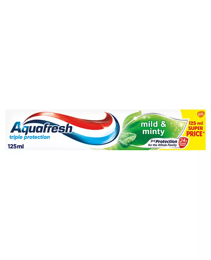 Pasta Aquafresh Mild & Minty to rodzinna pasta 3 w 1 o świeżym smaku. Zapewnia 24-godzinną ochronę szkliwa dzięki fluorkowi, który chroni zęby przed działaniem kwasów cukrowych przez całą dobę*. *przy szczotkowaniu 2 razy dziennie
