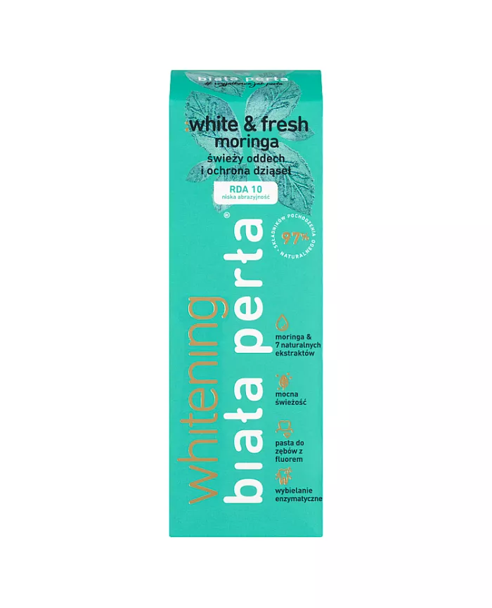 Pasta do zębów white & fresh moringa zawiera olej moringa i 7 naturalnych ekstraktów dla mocnych i zdrowych dziąseł i zębów. Substancje czynne Moringa oil działanie przeciwbakteryjne i regenerujące. 7 naturalnych ekstraktów dla zdrowych dziąseł i świeżego oddechu. Eukaliptus, rzepik, szałwia, rumianek, tymianek, goździk, aloes. Xylitol ochrona przed kwasami cukrowymi. Cynk, mentol długotrwały świeży oddech. Czy wiesz, że... moringa to azjatyckie drzewo, którego olej znajduje zastosowanie w produktach kosmetycznych i dentystycznych. Jest źródłem bogatym w mikro i makroelementy, witaminy (D, E, C, A) oraz przeciwutleniacze dla mocnych i zdrowych zębów i dziąseł. RDA tylko 10! Niska abrazyjność, bezpieczna dla szkliwa zębów naturalnych i wszystkich rodzajów licówek. Nadaje się również do szczotek elektrycznych.