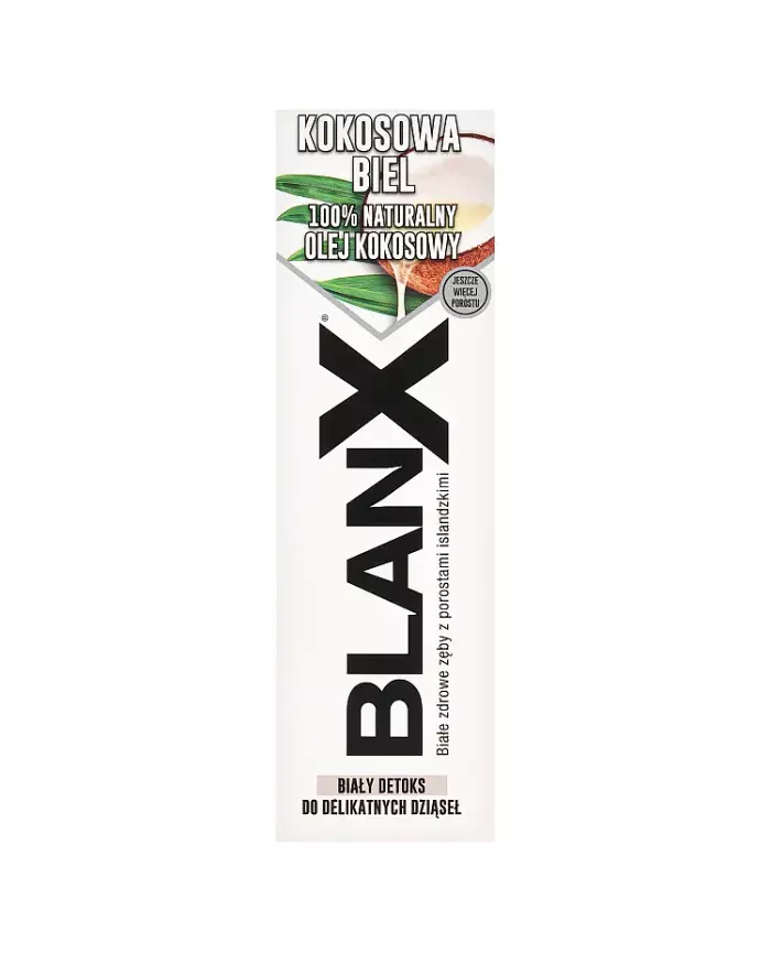 Kokosowa biel pasta do zębów ze 100% naturalnym olejem kokosowym - Olej kokosowy, dzięki właściwościom detoksykującym, działa kojąco i ochronnie na stany zapalne dziąseł. Działa na płytkę bakteryjną, pomagając chronić błony śluzowe jamy ustnej w celu przedłużonego działania detoksykacyjnego. - Olej kokosowy i porosty arktyczne łączą w sobie naturalny i trwały efekt głębokiego wybielenia. - Świeży i delikatny smak miętowo-kokosowy daje słodkie i przyjemne uczucie podrażnionym dziąsłom.