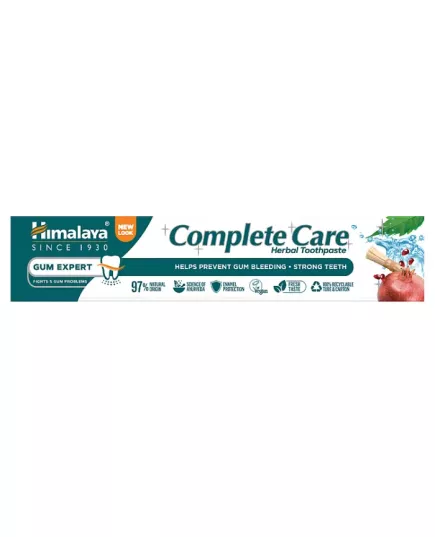 Zdrowe dziąsła to podstawa dla zdrowych zębów i prawidłowej higieny jamy ustnej. Linia past do zębów Himalaya Gum Expert zawiera wyciąg z rośliny miswak oraz naturalne środki ściągające, które zapewniają zdrowie i ochronę̨ dziąseł oraz szkliwa zębów. Ziołowa pasta do zębów Himalaya Gum Expert Complete Care dzięki zaawansowanej, ziołowej formule, zapewnia 12-godzinną ochronę̨ przed szkodliwymi bakteriami, pomaga przeciwdziałać́ krwawieniu dziąseł oraz zapobiega powstawaniu płytki nazębnej. Jest w 100% wegetariańska, zawiera fluor naturalnego pochodzenia. Kluczowe naturalne składniki aktywne, zawarte w paście Himalaya Gum Expert Complete Care to: • korzeń drzewa arakowego (miswak) - pomaga zapobiegać krwawieniu oraz stanom zapalnym dziąseł, wzmacnia dziąsła i zapobiega ich obrzękowi • owoc granatu – skuteczny środek ściągający • babool – pomaga zapobiegać stanom zapalnym dziąseł i zmniejsza ich krwawienie