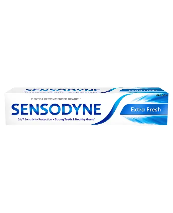 Jeśli podczas spożywania gorących, zimnych, słodkich i kwaśnych pokarmów, a nawet szczotkowania zębów odczuwasz krótki, przenikliwy ból, może to oznaczać, że Twoje zęby są nadwrażliwe. Sensodyne Extra Fresh to pasta do zębów z fluorkiem, dla wrażliwych zębów, której skuteczność została potwierdzona klinicznie. Jej specjalna, zaawansowana formuła łagodzi reakcję zakończeń nerwowych na nadwrażliwość głęboko we wnętrzu zęba, dzięki czemu zapewnia ulgę w nadwrażliwości. Skład pasty oferuje skuteczną ochronę przed nadwrażliwością nawet przez 24 godziny*, a także gwarantuje korzyści tradycyjnej pasty do zębów. Sensodyne Extra Fresh z fluorem odświeża i usuwa płytkę bakteryjną*, a dzięki zawartości fluorku wzmacnia szkliwo i chroni zęby przed ryzykiem wystąpienia próchnicy. Formuła z żelowym paskiem i przyjemny, miętowy smak zapewniają dodatkową świeżość, a Ty nie musisz już martwić się podczas jedzenia ulubionych posiłków! *przy szczotkowaniu 2 razy dziennie